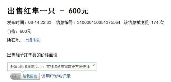 新民网记者查询赶集网,确有售卖国家二级保护动物红隼的信息,售卖600元。图片来源:赶集网