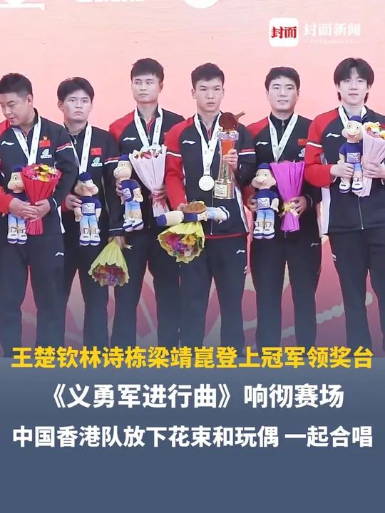 中国队是冠军!王楚钦林诗栋梁靖崑登上领奖台,《义勇军进行曲》响彻赛场,中国香港队放下花束和玩偶,一起合唱