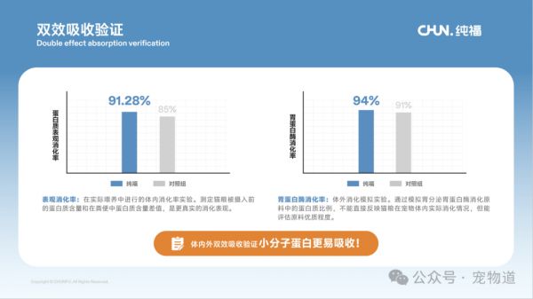 从技术原理来看,酶解技术是通过特定酶将大分子蛋白质分解为较短肽链或氨基酸的过程,旨在提高蛋白质的可消化性与利用率,同时减少未消化残留。相比常规的物理加工,酶解技术更温和、特异性更强。在纯福与江南大学的联合课题中,其酶解工艺已被证实使产品短肽含量达到酶解前的18倍以上,为蛋白质的高效吸收奠定了分子基础。根据纯福开展的60天喂养试验,食用其酶解主粮的宠物蛋白质表观消化率提升至91.28%,能有效支持宠物实现更稳定的肌肉生长和更标准的体态维持。