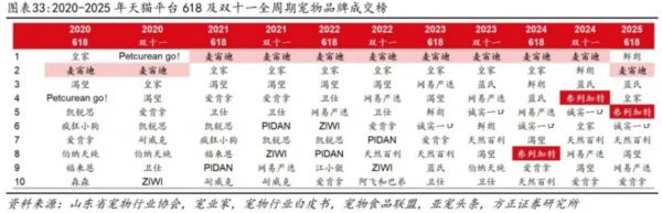更值得注意的是,方正证券研报中显示,在高爷家起家的核心线上渠道——天猫平台中,近三年来无论是618大促还是双十一购物节的全周期宠物品牌成交榜单中,高爷家均未进入前列,这一细节更直观凸显了国内宠物食品市场 “群雄逐鹿” 的激烈态势。