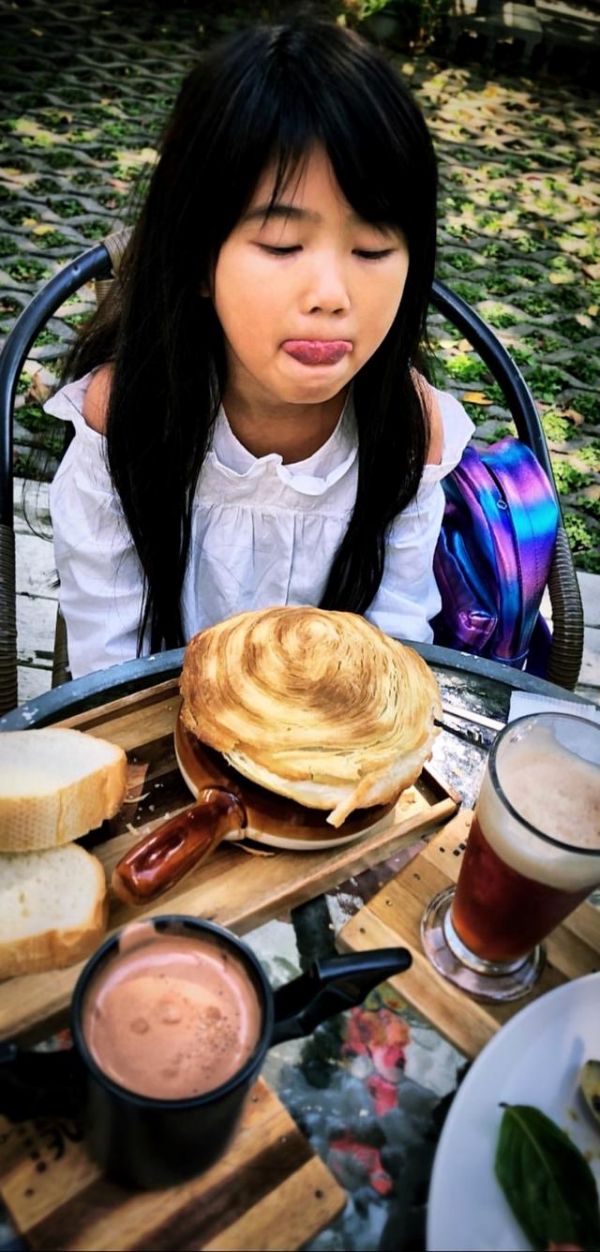 关注曹格一家的朋友们也明白他们的照片风格一向很有艺术气息,让人难以看清画中人真正的模样。下图中Grace看着眼前的软面包正舔嘴唇,正面四六分刘海的淑女模样真是没谁了,反正舟舟我可以!