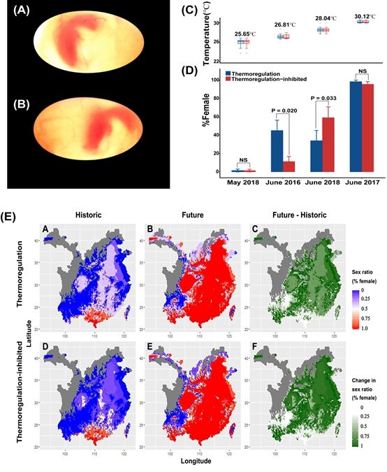 为了回答该问题,中国科学院动物研究所杜卫国研究员领导的团队以乌龟为对象开展了胚胎行为热调节和后代性比关系的研究。研究人员利用辣椒素受体阻断剂成功地抑制了胚胎的行为热调节,使胚胎无法选择适宜的温度发育。通过比较胚胎行为热调节受抑制和不受抑制后代的性比,发现胚胎行为热调节受抑制的后代基本都是偏雄(巢温较低)或者偏雌(巢温较高),而能在卵内选择适宜温度的胚胎,其后代性比接近于1:1。进而,研究人员利用上述行为和生理研究结果构建了机制模型,再结合历史和未来的气候数据,预测了未来气候变化条件下胚胎行为热调节对种群后代性比的影响,结果表明胚胎能够通过行为热调节缓冲气候变化对种群性比偏移的影响。