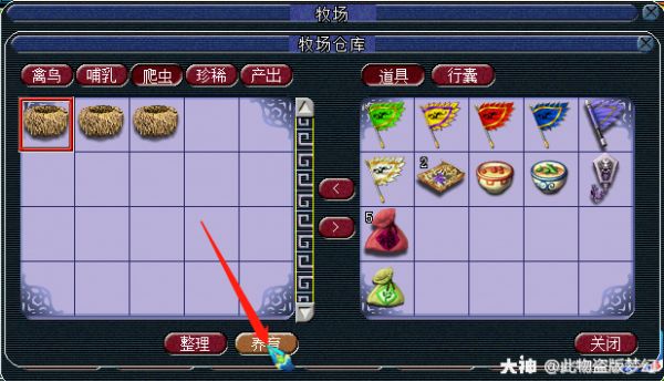 会跳出下图这个界面,你要做的就是邮件你道具栏中的窝,使它被放到你的牧场仓库中。然后在牧场仓库中选择相应的动物窝,再点击下方的养育即可。