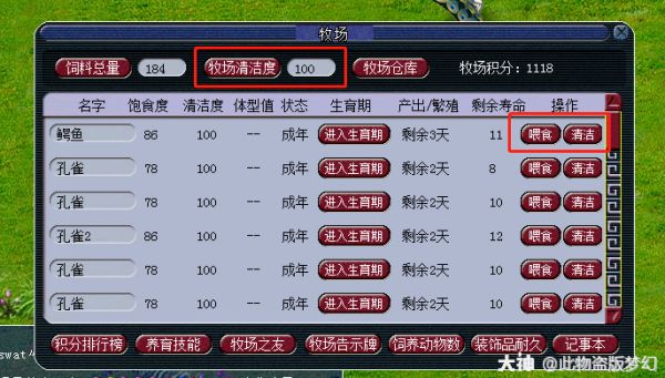 然后你每天要做的事情就是上线后清洁牧场和喂养动物,务必每天保持100清洁度。饱食度要根据不同动物采用不同的喂食方法。