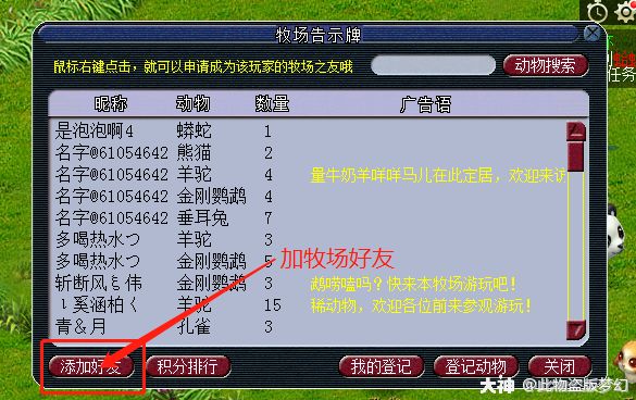 在你的牧场有动物成熟之后,点击牧场告示牌,再点击登记动物,将你未登记的动物全部登记上去,这样别人就能通过牧场告诉牌主动加你好友。