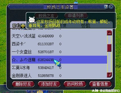 携带好后,点击牧场管理员,点击牧场好友。在好友列表中右键查看好友牧场饲养的动物信息,是否有和你一样的动物,有就点击访问。
