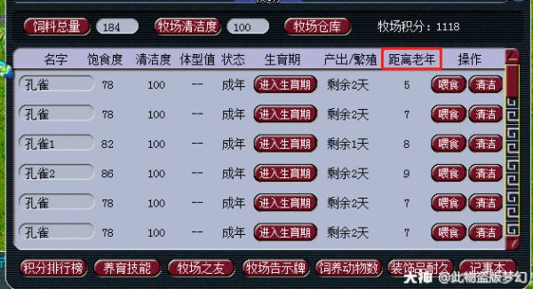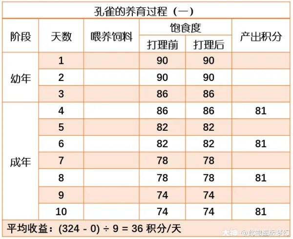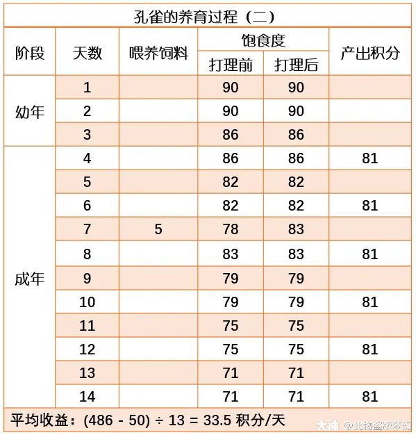 孔雀的初始饱食度是90,每两天消耗4点饲料。孔雀在饲养时不喂饲料,只有在孔雀成年后,拉出去繁殖出窝了,再喂5点饲料,在饱食度低于70或距离老年1天时出售。(孔雀白漂法饲养是从头到尾不喂饲料,出窝也不喂,窝不够用就去购买。)