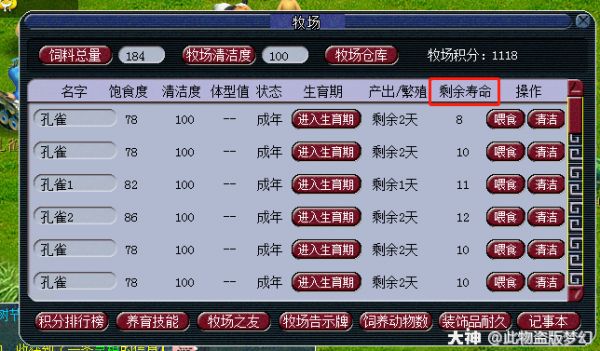 养殖后,第一天不喂食,第二天开始保持100的饱食度,每天消耗5点饲料。产出前连续三天保持100饱食度可获得特殊产物价值100积分。距离老年4天时,不再喂饲料。距离老年一天时卖出。