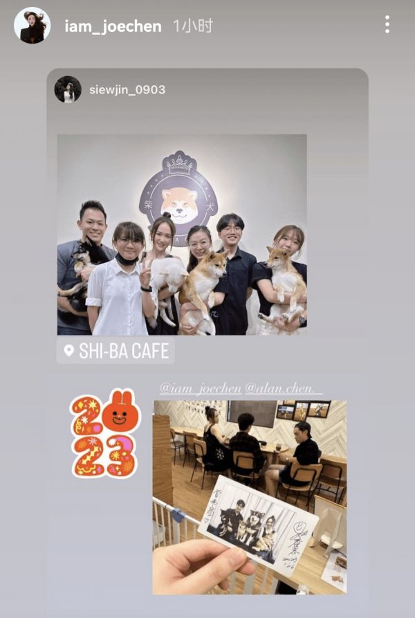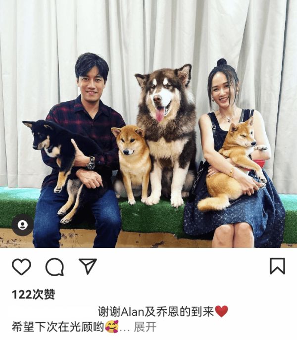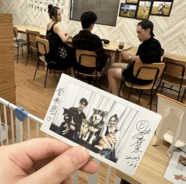 店主还给两人拍了一张与店里的宠物狗的合影,像极了温馨的一家六口!不知两人何时把生儿育女安排上日程?