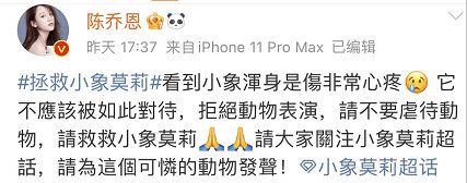 陈乔恩还经常转发一些小动物走丢的动态,关键时候她也会发文。陈乔恩曾经就为小象莫莉发声过,希望能取消动物表演,不要再虐待动物。