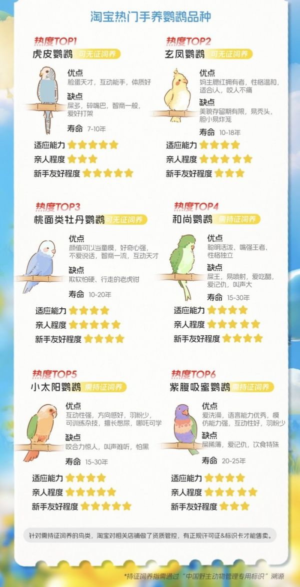 《淘宝热门手养鹦鹉图鉴》显示,“脸蛋天才”虎皮鹦鹉、拥有妈生腮红的玄凤鹦鹉、智商一流的桃面类牡丹鹦鹉、聪明活泼的和尚鹦鹉、擅长憋尿的小太阳鹦鹉成为淘宝销量排行前五的鹦鹉品种。