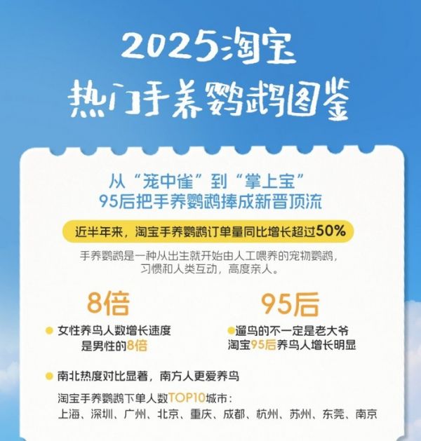 数据显示,近半年来,淘宝上手养鹦鹉订单量同比上涨超50%。和过去老大爷遛鸟的刻板印象不同,在淘宝上,年轻人才是养鸟主力军。95后人群增长最快,女性养鸟人数增长速度是男性的8倍。从地域上看,南方人对养鸟的热情远高于北方。在养鸟人数前十的城市中,上海、深圳、广州等南方城市占据九席。