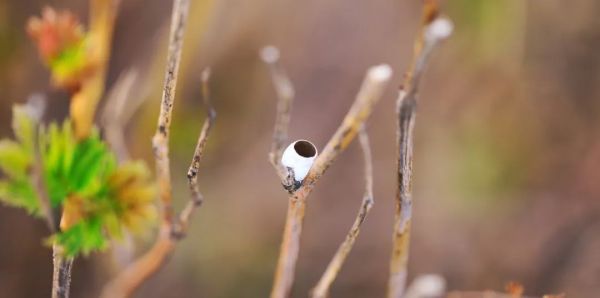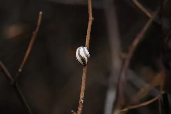 这种跟花生米差不多大小的“微型鸟蛋”,灰白底色上涂抹着褐色粗条纹,不怎么起眼,经常得凑近细看才能发现。它们多夹在枝丫分叉处,粘得很牢。如果强拉硬扯去摘,往往会连带树皮一起撕下来。“蛋壳”也异常坚固,徒手捏碎是有点难度的。