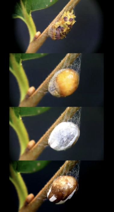 那液体功能类似水泥,等到它浸透茧壁、风干凝固后,就形成了坚硬的茧壳。洋剌子就在里面化蛹过冬,待来年春暖花开时破茧成蛾。