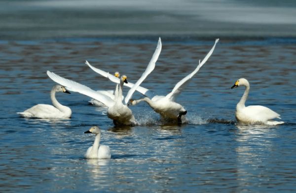 清澈的水面上,白天鹅嬉戏打闹,水花四溅。
