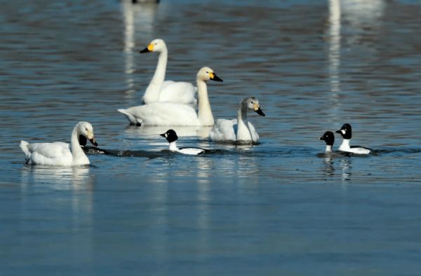 △白天鹅与鹊鸭正悠闲自在地泛游湖面