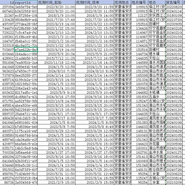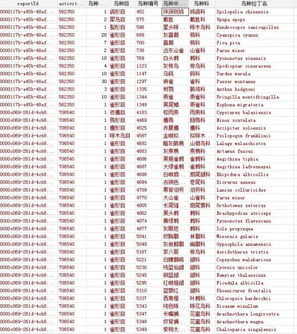 id reportId 观测时间_起始 观测时间_结束 观测地点 地点编号 地点 报告编号 鸟种数量 用户编号 用户名称 浏览数 经度 纬度 省 省代码 市 市代码 县 县代码 activity_id 鸟种数量 鸟种目 鸟种编号 鸟种中文名 鸟种科 鸟种拉丁名