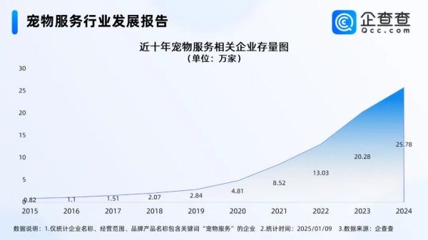 企查查数据统计,近十年宠物服务相关企业存量规模显著增长,自2015年末的0.82万家一路攀升至2024年末的25.78万家,截至2025年1月9日,2025年已注册1466家相关企业,宠物服务相关企业存量达25.91万家。