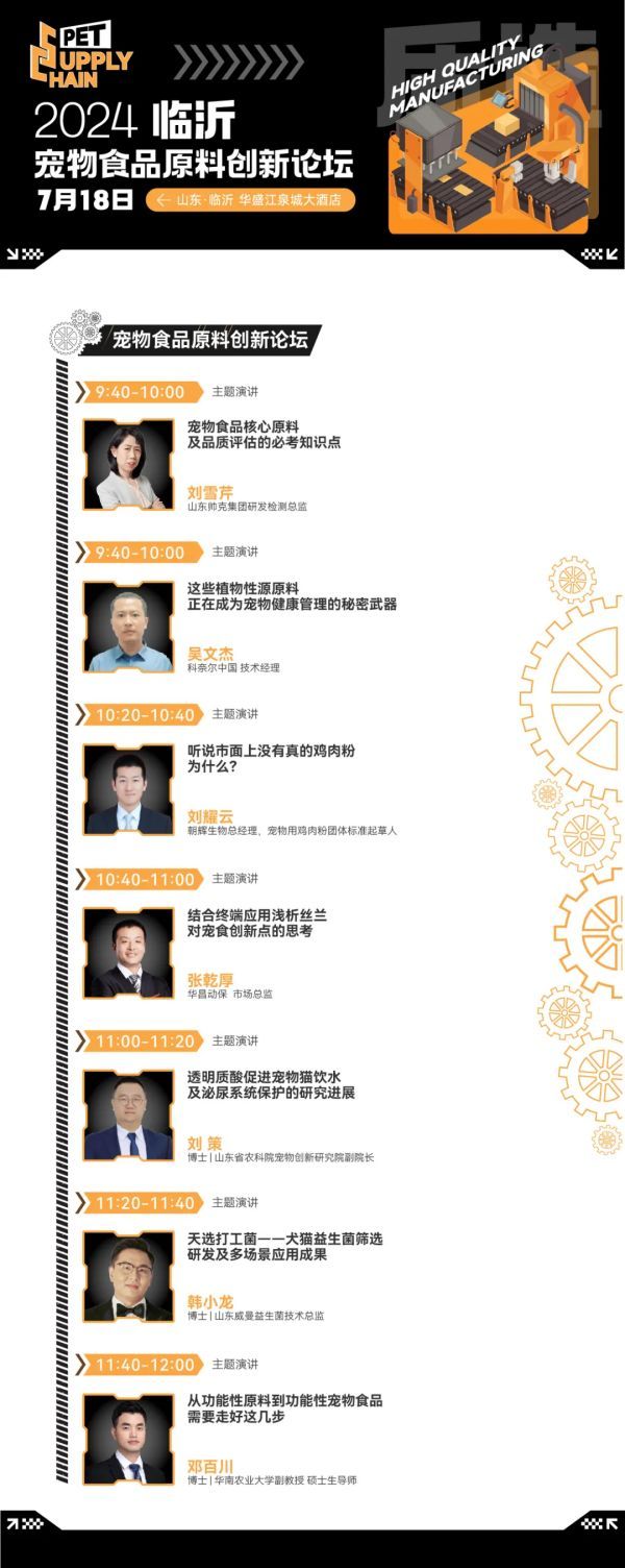 山东省宠物行业协会,将在07月18日 09:30 直播预约宠物供应链大会——宠物食品原料创新论坛视频号(单场直播定价99元)原料创新,一直是宠物食品行业重点关注的热点领域,也是从业者们众说纷纭、话题不断的争论焦点。在本届宠物供应链大会分论坛——宠物食品原料创新论坛中,主办方通过多维度访谈与梳理,提炼了当前宠物食品原料创新领域上的热点议题。其中不仅可以学到宠物食品核心原料及品质评估的必考知识点,还可以寻找有利于宠物健康管理的植物性源原料;学习丝兰和胆汁酸在宠食创新中的应用;听到一线从业者关于鸡肉粉的行业内幕;洞悉透明酸质对于猫咪泌尿道的呵护;以及犬猫益生菌在宠物食品中的筛选、研发及多场景落地与应用。具体议程如下: