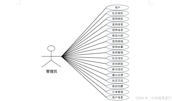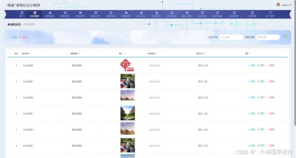 管理员进入主页面,主要功能包括对用户、社区规则、宠物类别、宠物信息、领养信息、商品分类、宠物商城、宠物故事、社区活动、活动类型、参与活动、建议反馈、社区交流、我的收藏、系统管理、订单管理、用户信息等进行操作。管理员主页面如图5-8所示: