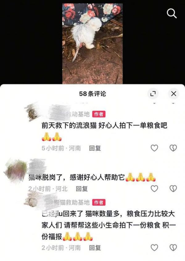 当天,记者搜索了此前盗用李女士视频的抖音账号“流浪狗猫救助基地”,此前该账号曾回复网友:“小猫已经救助回来了,猫咪数量多,粮食压力比较大,家人们请帮帮这些小生命拍下一份粮食,积一分福报。”