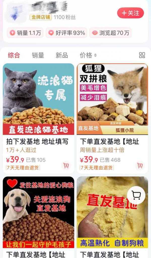 记者看到,账号链接的商家橱窗内挂了多个商品信息,销量靠前的几个商品是狐狸粮、狗粮以及猫粮,且均为“只拍不发货”的虚拟商品,备注显示这些粮食将直接发往救助基地。这些商品价格以粮食重量被售至39.9元到近2000元不等,销量最高的狐狸粮已售出468单。