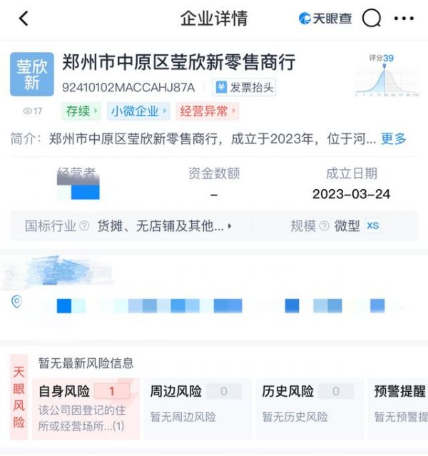 此外,该账号简介为“郑州市中原区莹欣新零售商行员工”,随后,记者拨打了莹欣新零售商行的电话,已经停机。天眼查显示,该商行已被列入经营异常。