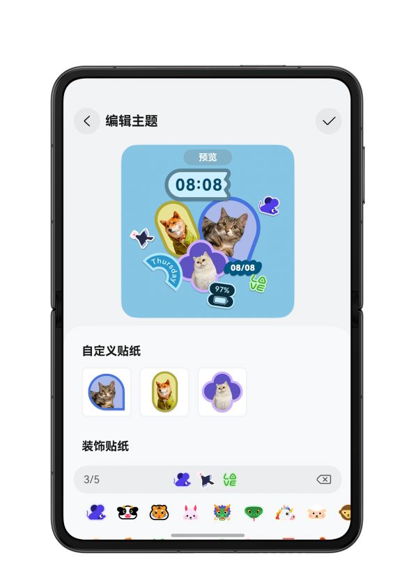 您可以选择一款您喜欢的外屏主题,一步应用到外屏熄屏显示、锁屏壁纸、桌面壁纸等。