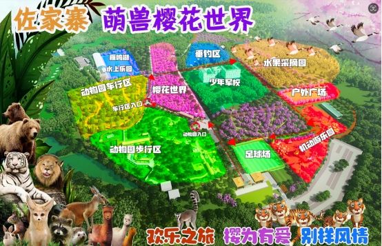 佐家寨萌兽樱花世界是以百虎园为主题的萌兽动物园,分有百虎园、萌宠园、飞鸟世界、天鹅湖、花海、研学营等14个区域,园内饲养老虎、狮子、鹿、陆龟等多种动物。在这里,你不仅可以看到像老虎、狮子等大型的野生动物,还可以近距离观察金丝猴、梅花鹿等各种萌宠,感受它们的活泼与可爱,也可以参与喂养活动,亲近动物。这里是孩子们的乐园,大人们放松心情的好去处。