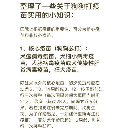 宠物狗是许多家庭的重要成员,为了保障宠物狗的健康,我们需要及时给它们接种疫苗和进行驱虫。然而,许多狗主人不清楚接种疫苗后应该何时进行驱虫,本文将详细介绍宠物狗疫苗后的驱虫时间和方法,帮助狗主人更好地照顾自己的宠物。