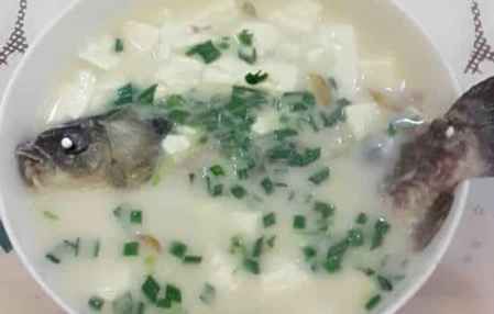 材料:鲫鱼,嫩豆腐,姜,蒜,盐,香菜,葱。