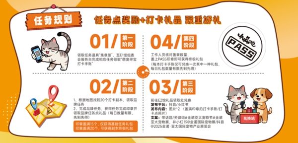 福利方面,展会诚意拉满:打卡集章领豪礼活动中,前往指定展位完成互动即可集章,集满规定数量印章即可兑换集章大礼包。针对购票观众,入门既有门票核销礼包,参与现场各项活动获赠礼包,更有机会获得品牌正装大礼包等惊喜;到场观众还能领取品牌宠物零食试用装、洗护用品小样及活动限定纪念品,即使未携宠,参与现场转发、关注等社交任务,也有机会赢取品牌正装礼品。目前早鸟票已开售,扫码购票可提前锁定资格,展会期间地铁11号线直达展馆,现场设免费接驳班车,自驾观众更享免费停车服务,出行便捷无忧。