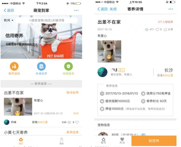 宠物寄养并不新鲜,搭“共享经济”便车的宠物寄养平台也不少,但其中的问题却很多。对于主人来说,宠物医院、宠物店在需要中、长期寄养的场景下费用高昂,而且宠物的体验也很差。纯商业寄养平台,主人会担心宠物只是被关在笼子里;而陌生人寄养,则由于之前缺乏信用保障机制,担心宠物失联、丢失、照顾不周等状况发生。
