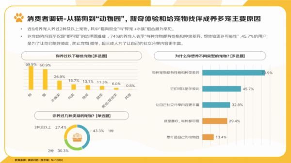 为何选择多宠组合?73.9%的用户表示是因为“每种宠物都有性格和种类差异”,希望体验不同互动;也有不少人希望宠物之间能相互陪伴,也可以丰富社交平台分享内容。