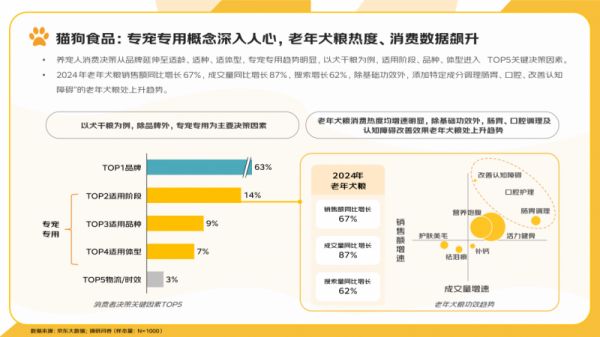 不仅如此,宠物食品也呈现专宠专用趋势。除品牌因素外,适用阶段、品种、体型成为消费者主要购买决策因素。以犬粮为例,老年犬粮在近一年间搜索量同比增长62%,销量增长87%,成交额增长67%,成为增速最快的细分品类之一。
