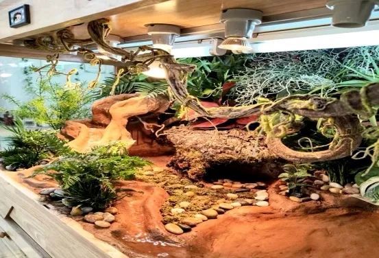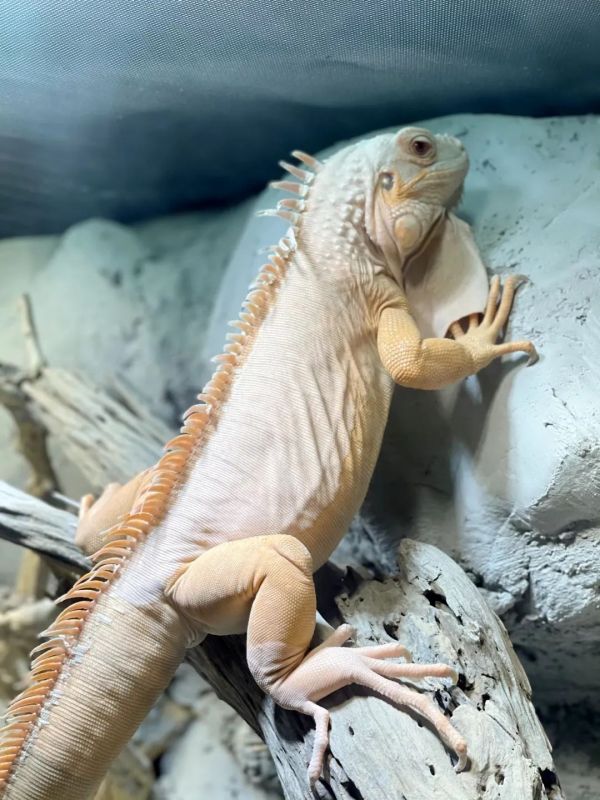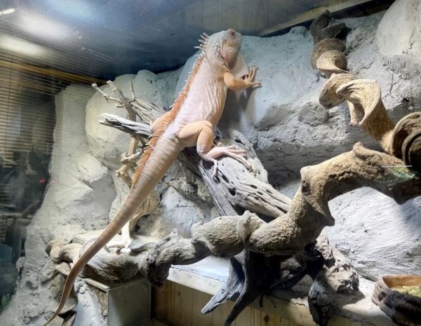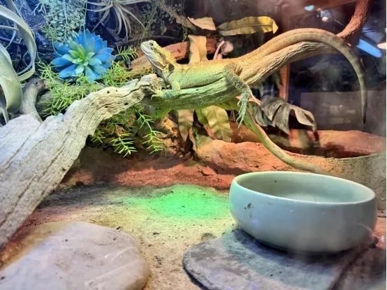 走进店内,位居C位的是一只白化红鬣蜥,江湖人称“爬宠哈士奇”。ins风橙系皮肤自带美颜滤镜,体长约120厘米,性格温顺、呆萌,可rua可捧的活体“暖手宝”。素食主义蜥蜴每周2—3次投喂、定期蜕皮,适合爬宠小白、亲子家庭、佛系铲屎官(需带芯片及标识卡饲养)。为了模拟更自然的生态环境,Jason在饲养缸内精心布置了原生景观,这只鬣蜥在缸内活动自如,仿佛真的置身于野外。