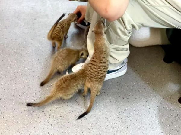 这群狐獴堪称“社牛”,萌系社交悍匪实锤,出了笼子就上蹿下跳,见人就“碰瓷”,扒裤脚、叼鞋带,摆起pose比游客还熟练。虽然长着一口小尖牙,但经过驯化,早就收起锋芒了,手指入嘴零攻击。