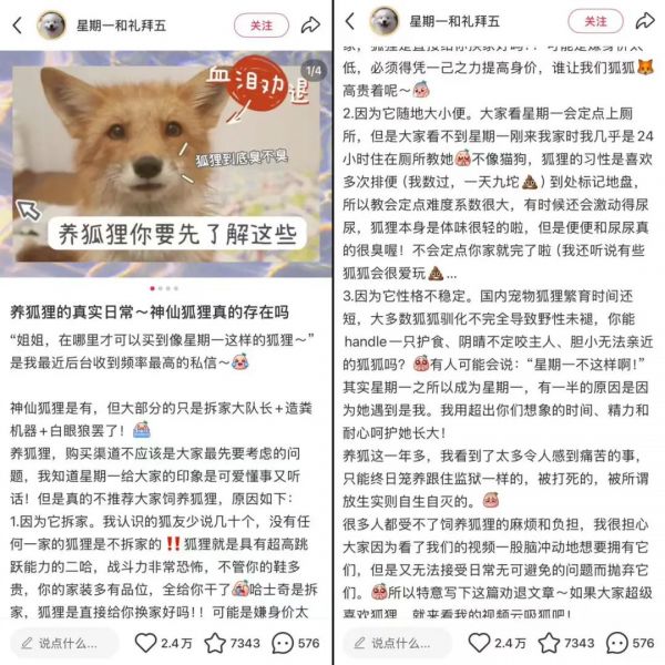 此外,@星期一和礼拜五 也会真诚分享饲养狐狸的心得,比如告诉大家狐狸会拆家、随地大小便、性格不稳定,以此劝诫那些被视频打动后想要购买狐狸的人谨慎饲养,这种真诚劝诫也获得了更多用户的信任和认可。观看其笔记,基本都维持着良好的互动数据,不时会有点赞破万的笔记冒出,足见用户对账号一直保持着浓厚的兴趣。