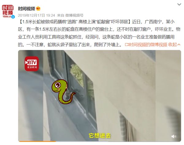 2019年,广西南宁一高层就发生了“蛇敲窗”。当时,一位住户将一条1.5米的蛇带上了楼。在变成“药膳”前却逃跑了,顺着外墙跑到了邻居窗外。可能是爬得太累或者天气太热,为了进屋的蛇用头疯狂撞击窗户玻璃。那个场面吓坏了住户与周围的邻居,最后物业赶来用捕蛇工具将其制服。