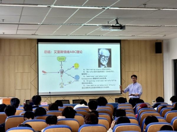 为帮助学生掌握应对方法,王老师引入艾里斯情绪ABC理论,详细阐释A(诱发性事件)、B(信念)、C(情绪和行为后果)、D(不合理信念辩论)、E(新的情绪及行为效果)之间的关系,指导学生通过调整认知来应对负面情绪。讲座最后,王老师寄语学生“打破‘焦虑’的是行动,冲破‘迷茫’的是规划” ,鼓励大家积极面对大学生活。