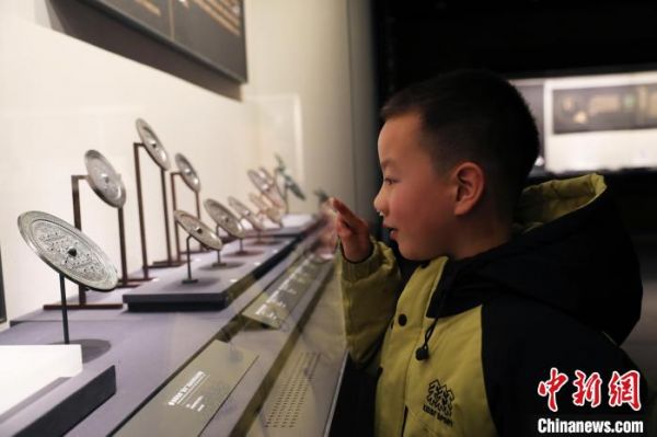 1月25日,一名小朋友在阜阳市博物馆观看馆藏文物柿蒂纹座“蔡氏”铭禽兽博局纹铜镜,该文物上有蛇形图案。魏振伟 摄