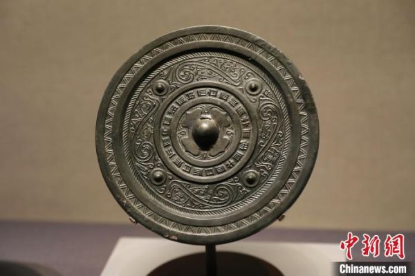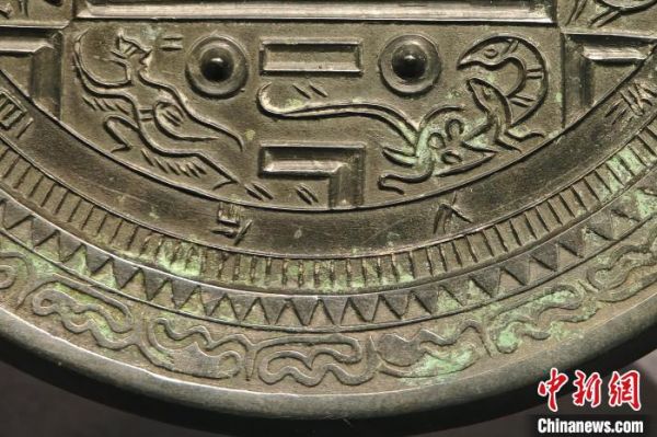 1月25日,阜阳市博物馆展出的馆藏文物柿蒂纹座“昭明”铭四乳四虺纹铜镜,该文物中有经典的蛇纹“蟠虺纹”图案。魏振伟 摄