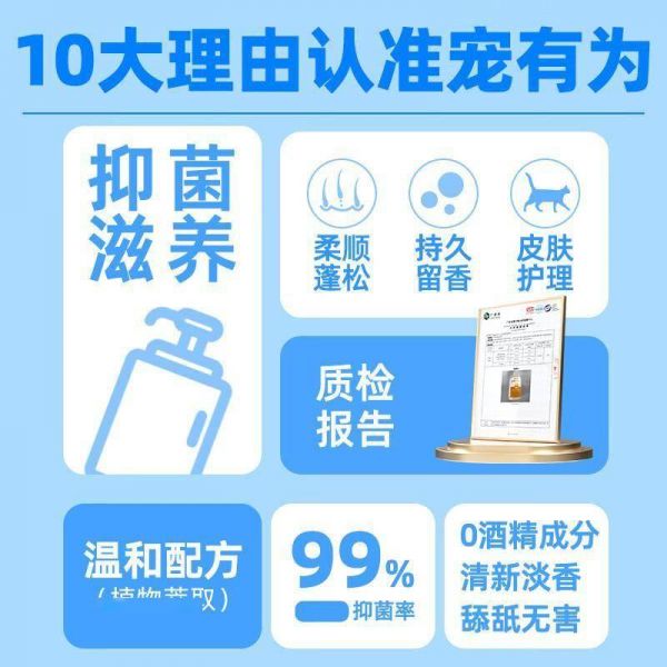 如果宠物有皮肤敏感问题,应选择无泪配方、低敏配方的沐浴露,避免含有刺激性化学成分的产品。