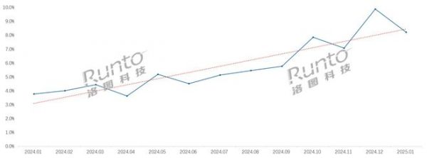 洛图科技(RUNTO)分析了传统主流电商上的销售数据,2024年,具有“宠物识别”功能的摄像头销量超过了140万台,较2023年的同比涨幅超过100%,在当年的线上市场占比达到5.5%。进入2025年,相关产品在1月的渗透率直接升至8.4%,比2023年同期提升了4.1个百分点。