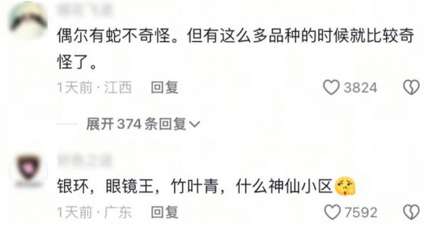近日,广州市黄埔区合景天俊小区有业主称小区内出现“剧毒金环蛇”。随后,有人称该蛇并不是金环蛇而是“宠物蛇”。据悉,该小区曾有业主被蛇咬伤,小区内也因频繁“蛇出没”冲上热搜。