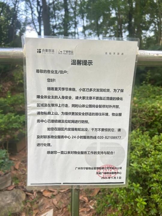 记者现场看到,此前张贴的公告显示:随着夏天季节来临,小区已多次发现蛇类,为了保障全体业主的人身安全,请大家注意不要靠近茂盛的绿化区域及在草坪上行走,同时山体公园将暂停对外开放,请勿私自上山。