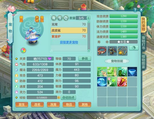 因为有“萌宠同行”活动存在,皮皮鲨可以免费培养为全高书宠物,少侠们可根据自身拥有护符的情况灵活选择打书,核心技能是“高级法术连击”和“高级灵蕴”。