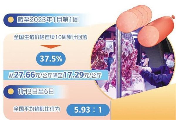 截至2023年1月第1周,全国生猪价格连续10周累计回落37.5%,从27.66元/公斤降至17.29元/公斤,部分主产区已经降至16元/公斤左右。