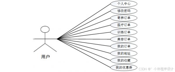 (3)用户可以实现对个人中心、修改密码、寄养订单、医疗订单、训练订单、美容订单、我的订单、我的地址、我的收藏、我的优惠券等信息进行操作,用例分析如图3-3所示。