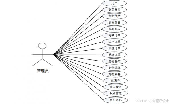 (2)管理员可以对用户、商品分类、宠物种类、宠物商品、寄养服务、寄养订单、宠物医疗、医疗订单、宠物训练、训练订单、宠物美容、美容订单、优惠券、系统管理、订单管理、用户资料等进行基本的信息管理。其用例分析如图3-2所示。